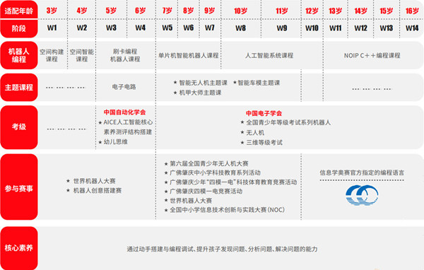 3-6岁以机器人搭建和趣味编程为主,6岁以上逐步学习传感器、电机控制及代码编程,并通过机甲大师竞技、无人机操作等实践项目提升综合能力。